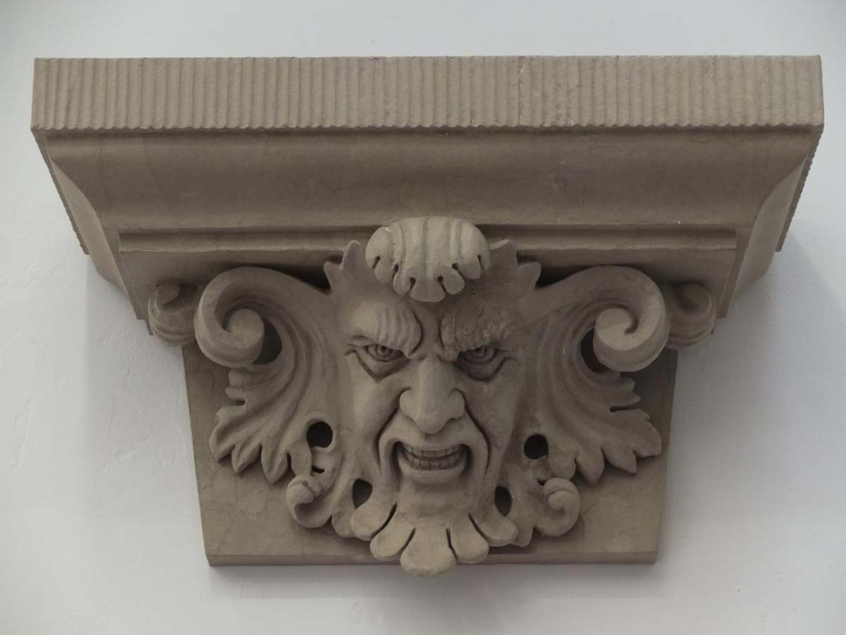 Ornament Blattmaske Zwinger KategoriePlastik Studienarbeit Ornament (Styropor und Papierkaschur, links bemalt rechts unbemalt, ca: 110cm x 40cm x 60cm)